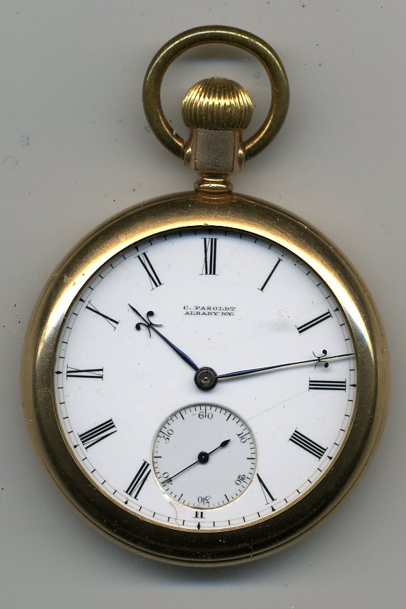 Extremely rare, one of only two completed movements known and the only example extant in its original case. Sold by Fasoldt and listed in his record of watches as sold to the Soldiers' Relief Bazaar, Albany, N.Y. on March 3,1864, as a "ladies Chronometer movement, no 112" for the (presumably) discounted price of $67.20.